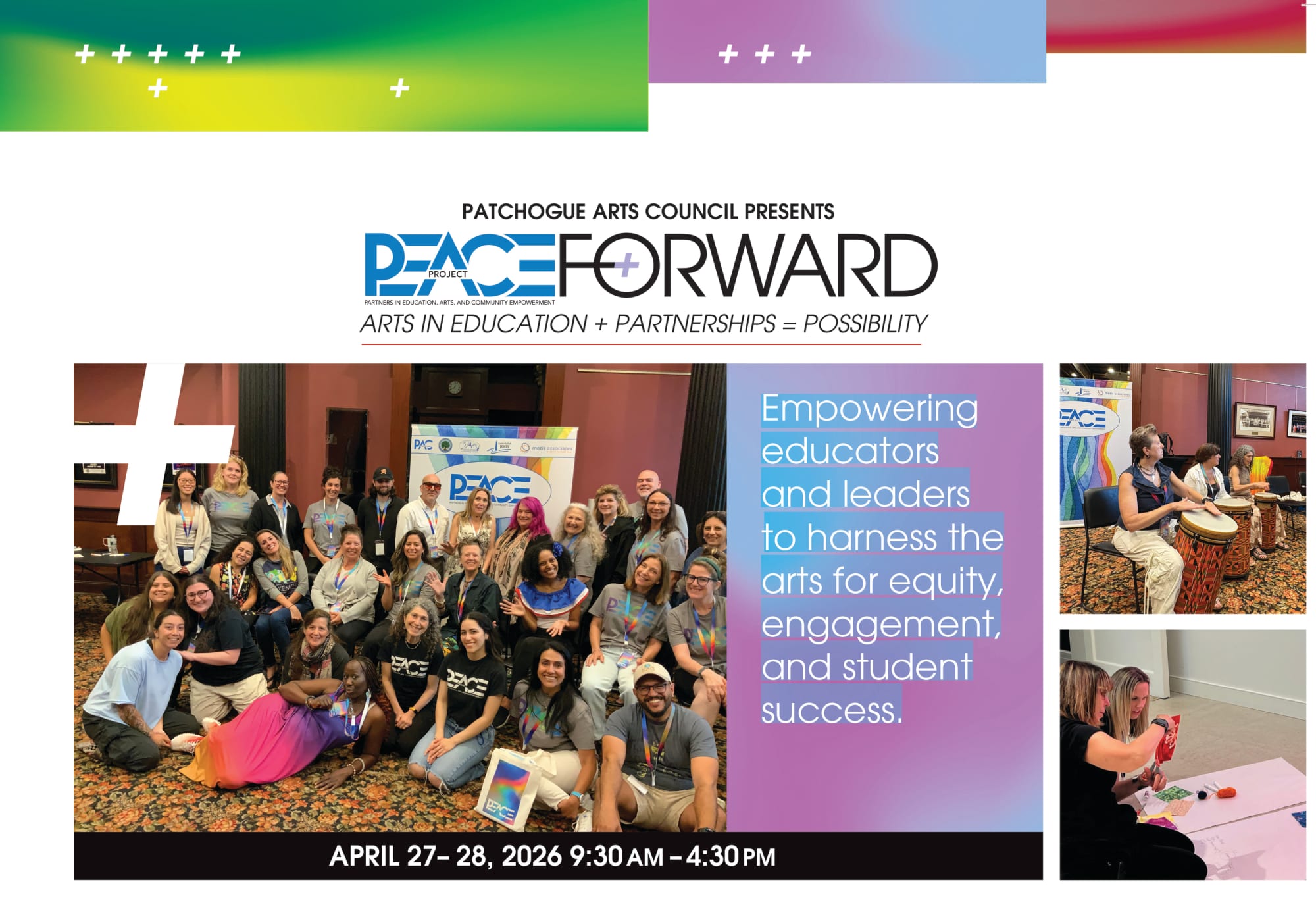 At a time when schools and communities are seeking stronger engagement, belonging, and future-ready learning, PEACE Forward convenes the people building impactful arts-in-education models now—connecting classroom practice with policy, partnership, and long-term sustainability. Grounded in the impact of PAC’s PEACE Project, the conference highlights partnerships that deepen student engagement, expand access t creative learning, and build lasting connections between schools and communities. Patchogue Arts Council’s (PAC) PEACE Project provides professional development for middle and hih school educators, teaching artists, and cultural partners across Long Island.